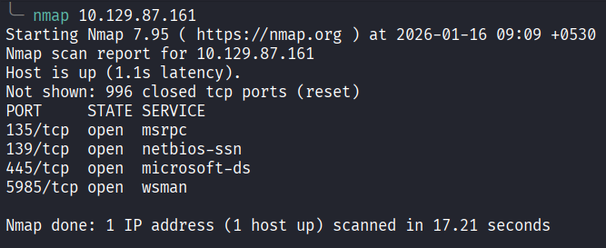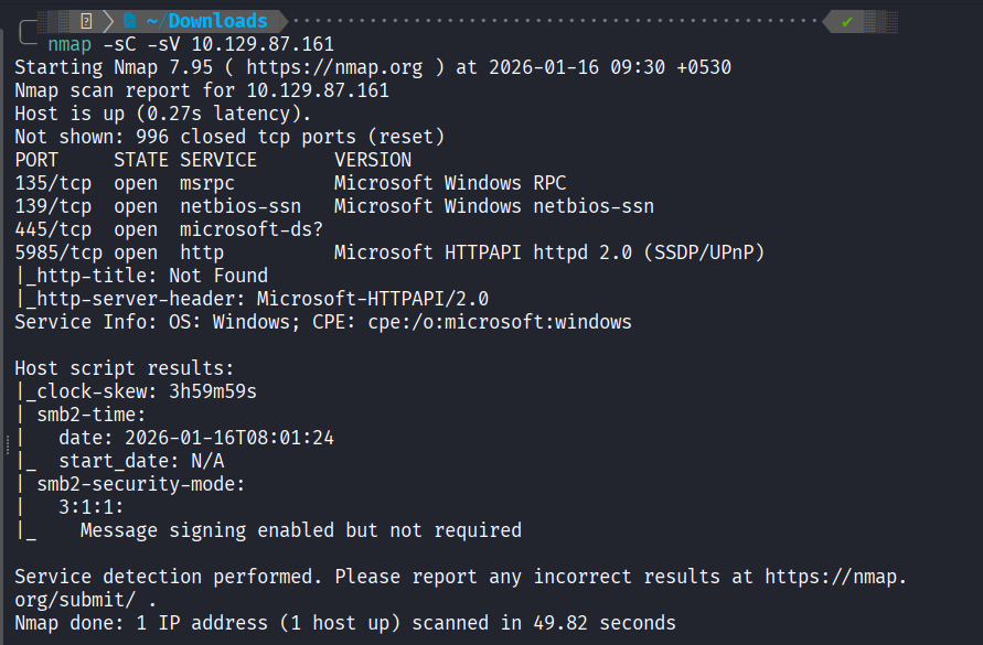 Initial Scan: Identified Ports 135, 139, 445, and 5985 are open.