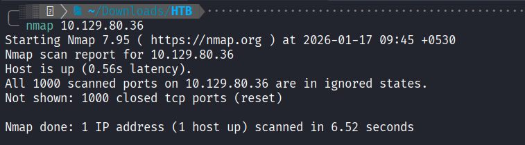 Initial Nmap Scan: Identifying open ports (None found in top 1000).
