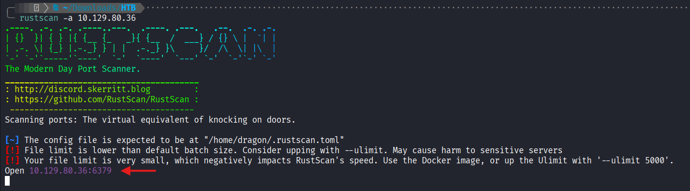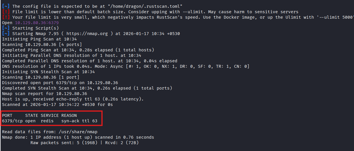 rustscan -a 10.129.80.36Findings: Port 6379 is open.