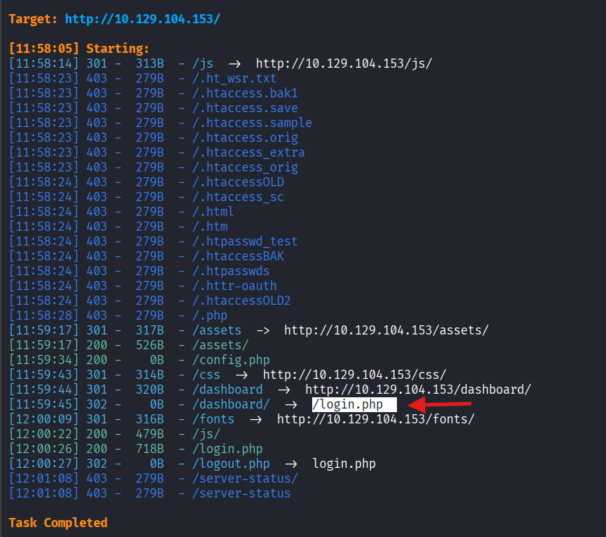 Discovered /login.php and /dashboard/.