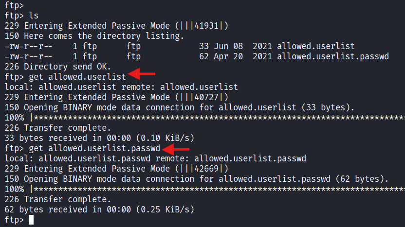 anonymouswith no password. - Downloaded the following files: