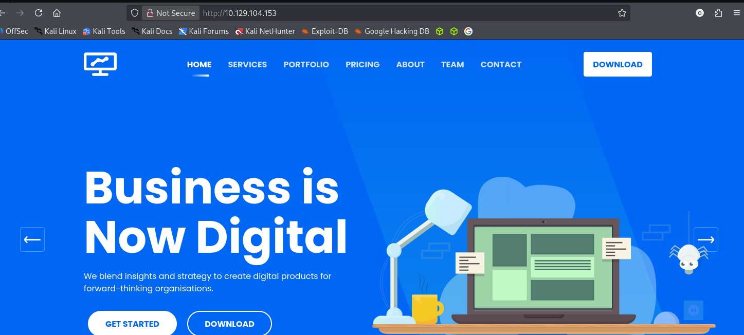 Navigating to http://10.129.104.153 reveals a business template landing page with no obvious login fields.