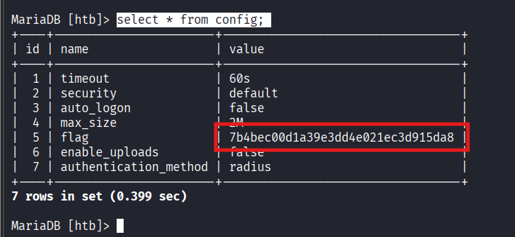 htbdatabase. - Exfiltration: Retrieved the flag from the