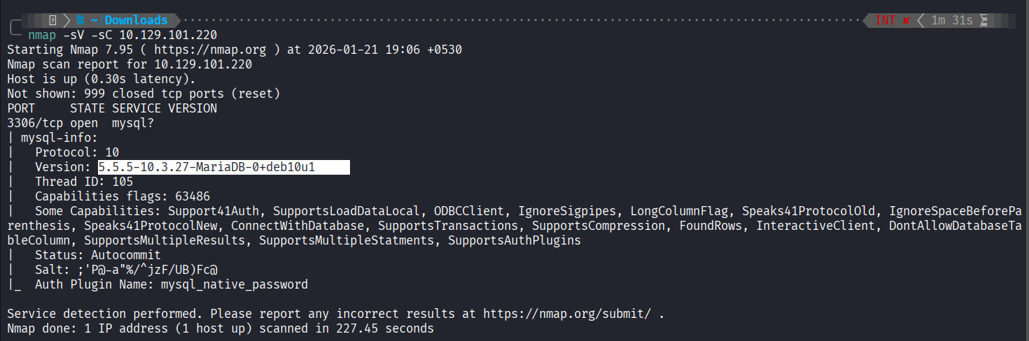 nmap -sC -sV -p 3306 10.129.101.220Findings: