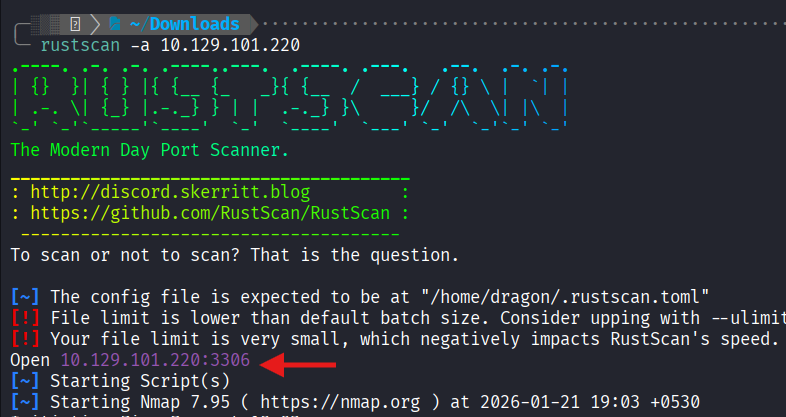 - Rustscan: Successfully identified Port 3306 as open.