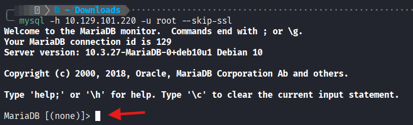 mysql -h 10.129.101.220 -u root --skip-sslNote: The --skip-ssl flag was used to avoid potential connection issues with default SSL configurations.