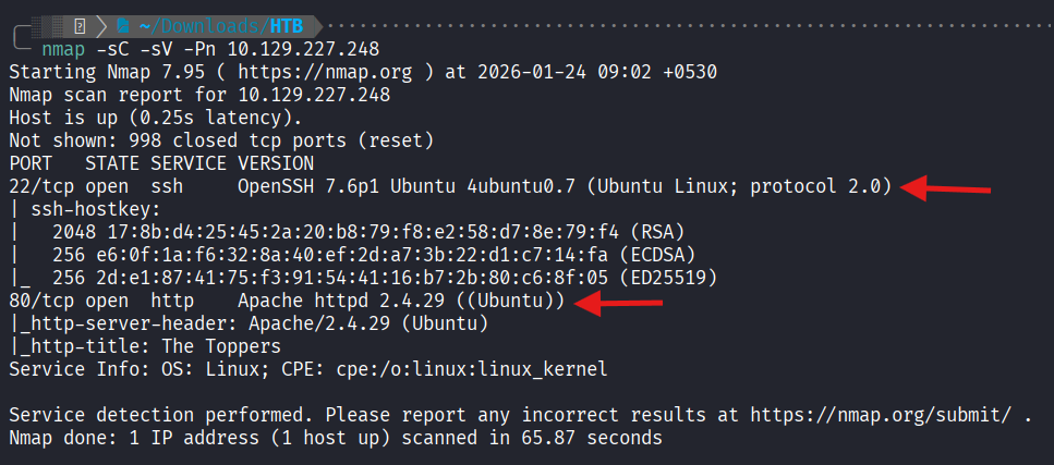 | 80/tcp | HTTP | Apache httpd 2.4.29 | Title: The Toppers |