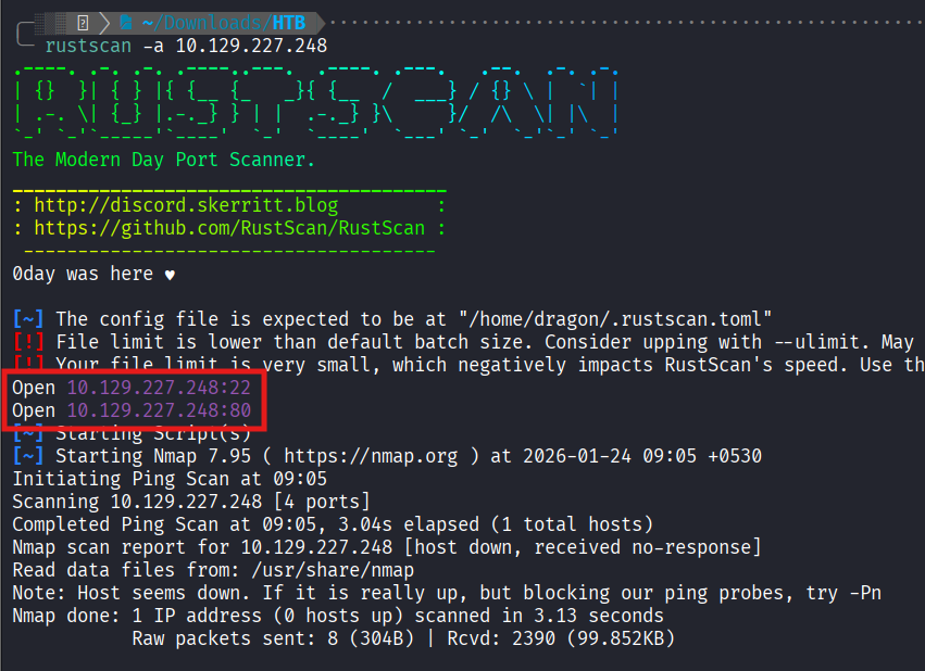 - Rustscan: Rapidly identified Ports 22 and 80 as open.